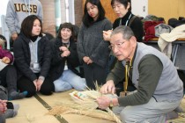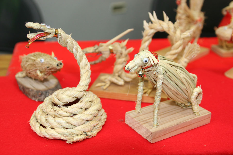 野村さんは農政事務所の前身にあたる食糧事務所に長く勤務、兼業農家でもあり公私ともに米作り一筋に歩んできた。「昔の農家は、冬の間はずっと藁仕事をしたもんで、正月二日がその仕事始めやった」。野村さんの記憶では、俵を作らなくなったのは昭和30年代、むしろや草鞋は昭和40年代、昭和50年代には藁仕事そのものをする人は殆どいなくなったそうだ。藁仕事が消えることを惜しんだ野村さんは、30年ほど前から趣味で干支飾りや宝船などの縁起物をつくるようになり、地元に農産物販売所「湖東美咲館」ができると農村らしいものを販売したいと12月を迎えるとしめ縄や干支飾りを出品するようになった。