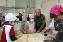 伊吹山文化資料館主催の体験教室「伊吹まるかじり隊」の子どもらが育てた蕎麦を打ち、食するイベントで「伊吹山では蕎麦と一緒に大根も根付いていた」と栽培の歴史を話した山内さん。この活動は14年目で、毎年講師を務めておられる(平成29年12月23日)