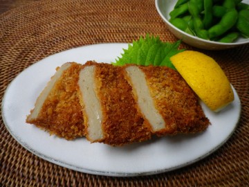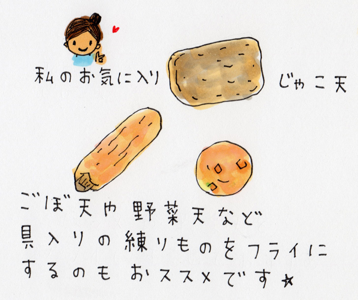 - 魚天ぷらに小麦粉→溶き卵→パン粉の順に衣をつけて、180度の油でカリッと揚げる。