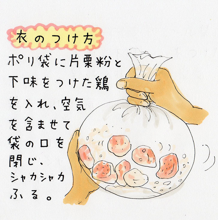 - 1に片栗粉をまぶし、160℃の油で表面の色がうっすら変わるまで揚げて一度取り出す。