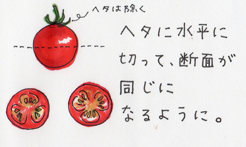 - ミニトマトを洗って水けを切る。ヘタをとり、半分に切る。