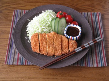 自宅でレシピ作成の仕事をするようになってから、我が家にはずいぶんと器が増えました。私の得意分野はイタリアンなので、選ぶ器は白のツルツルした磁器が多いのですが、最近ちょっとしたご縁でいただいたのがその正反対、黒泥の九寸皿です。マットな質感で、フォークとナイフを使えばガリガリいやな音を立てるし、厄介なやつがやってきたなぁ…と思っていたのですが、先日久しぶりに作ったとんかつを盛りつけたら「ん、おいしそう!」なのです。渋い暗めの器と千切りキャベツの淡い緑のコントラストが美しく、普通のおうちのとんかつが、重厚感のあるお店のとんかつに大変身。お箸を使うのでガリガリいやな音も立ちません。料理と器の相性ってあるんだなぁとつくづく思いました。食材や調理法はもちろんですが、見ためもおいしさの大切なエッセンスなのですね。
