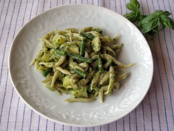バジルの葉(枝を除く)50g、松の実(なければクルミでもよい) 30g、塩 小さじ1/2、にんにく 1かけ、オリーブ油 100ml、パルメザンチーズ(粉)大さじ5