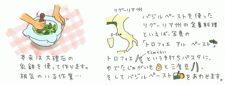 残暑の厳しい毎日が続きますが、9月という言葉の響きだけでも、秋に近づいた感じがします。今年はプランター栽培したバジルがとても元気で、例年以上の収穫ができました。以前よりもずいぶん身近になった食材のひとつですが、増えすぎても使い道に困りますよね。バジルはシソ科のハーブなので、冷奴や和え物など、シソの代わりの薬味としても使っていただけますが、大量に消費するとなれば、やはりバジルペーストでしょうか。イタリア北西部ジェノヴァの郷土料理として有名で、別名ジェノベーゼペーストとも言います。材料をミキサーにかけるだけの簡単ペーストは、冷凍保存もできるのでおすすめです。バジルの葉とオリーブ油を混ぜ、あらかじめ冷凍庫で冷やしてからミキサーにかければ、熱が伝わりすぎず、鮮やかな緑色が保てますよ。