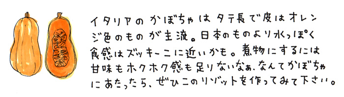 イタリアと出会って早15年…それ以来毎年のように訪れています。そこまで惹かれる理由はもちろん料理にあるのですが、イタリア料理の中で何が一番好き?と聞かれると、正直一つにはしぼれません。お肉たっぷりミートソース、魚介の旨味とトマトの酸味が絶妙なリゾット、もちもち感がたまらないナポリピザ…でも結局一番心に残っているのは、イタリアのマンマ(お母さん)達の作る素朴な料理かもしれません。味はもちろんですが、それ以上に作り手の愛情がぐっと伝わってくる気がして、そしてそんな料理を私も作りたいな、と思うから今でもイタリアに通い続けているのだと思います。この季節イタリアの家庭では、あり合わせの野菜をたっぷり入れたスープやリゾットが食卓にあがりますが、日本ではちょうど冬至、カボチャのリゾットなどいかがでしょうか。心も体も、ほっと温まりますよ。