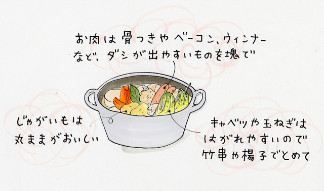 師走に入りました。いつも以上にせわしない月ですが、もしも時間を見つけたら、ポトフを作ってみませんか。煮込んだ具材はもちろん、スープが本当に滋味深く、体の芯まで温めてくれます。ポイントは1つだけ、とろ火で焦らずゆっくり煮続けること。そうすることで、旨味のある澄んだスープに仕上ります。「時間がない、もっと早く」とつい何でも効率的に進めようとしてしまうけれど、時間をかけるからこそできることもある、日々の生活も同じだなぁと、ふと我に返ります。