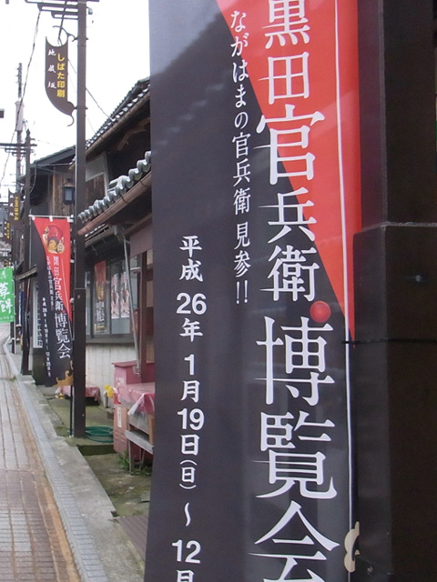 JR木ノ本駅から東にのびる地蔵坂商店街は、「黒田官兵衛博覧会」の幟やポスターがそこここに見られ、「黒田」の「黒」と官兵衛所用の兜の色にちなんだ「赤」で満ちている。その上、各商店ごとに黒田官兵衛にちなんだオリジナル商品がつくられているらしく、「この店にはどんな官兵衛が…」と、目移りするほどだ。