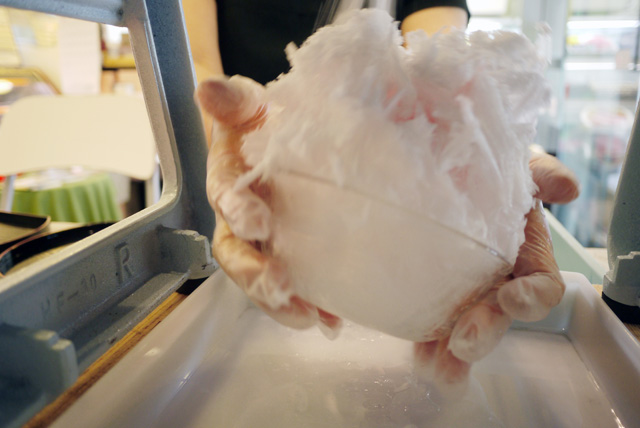 氷を機械にセットして起動させ、くるくると器を転がすようにしながら、久子さんはかき氷をつくってくれた。日に何百杯も出るというお店でかき氷をつくっていた手つきはさすが。雪玉のようなかき氷が完成し、久子さんおすすめの、とちおとめのシロップとミルクをかけてもらった。