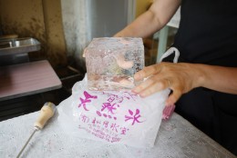 彦根旧城下町にある花しょうぶ通り商店街の肉屋、「こにし本店」さん。お昼前になると、コロッケやメンチカツを揚げる匂いが周囲に充満し、たまらない気持ちにさせられるお店だ。近江牛を使ったコロッケがおいしいと噂のこのお店で、かき氷の販売が始まった。なぜお肉屋さんでかき氷が…? というのも、この「こにし本店」の奥さん、小西久子さんのご実家が、栃木県日光で「氷の蔵元」をしているからだというので、謎が氷解した。