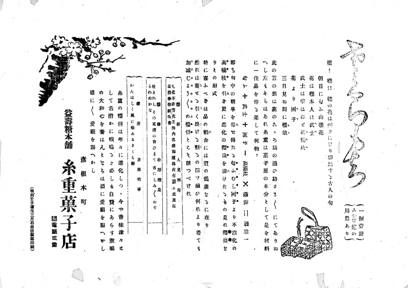 今年でちょうど創業200年となる彦根城下のいと重菓舗に、桜餅の方程式が残っていると聞いた。保存されている古いチラシに書かれているというので、訪ねてみた。