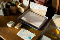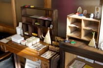 至る所に床屋さんの面影が残る店内には、佐々木文具店オリジナルの文具や、友美さんがいままでにコレクションしてきた文具などが並んでいる。中でも「びわ湖スタンプ」は、その名の通りびわ湖をかたどったスタンプで、若い女性を中心に人気の商品だ。その他、今後は古道具なども取り揃えていく予定だという。また、店内での喫茶も可能で、もともと備え付けの洗面台だったカウンターをテーブルにして、珈琲や自家製ジュースを味わえる。