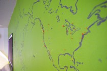 ところで、eight hills delicatessenの店内の壁には大きな世界地図が描かれている。旅行好きで地図が大好きだという武士郎さんが自ら壁に描いた世界地図で、行ったことのある場所にピンが刺してある。「このピンの場所全部に行ったんですか?」と聞いたら「最近はお客さんが自分の行ったことのあるところにピンを刺すようになったので、このピンの場所全てに行ったわけではないですけどね」と武士郎さんは笑いながら教えてくれた。それからしばらくの間、地図を見ながら旅行談義に花が咲いた。僕も学生時代バックパッカーをやっていたので、世界地図を前にするとつい話が弾んでしまう。「お店が軌道に乗ってスタッフも増えたら、みんなでスペインにハムを食べに行きたい」と武士郎さんは少年のように話す。