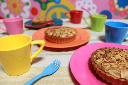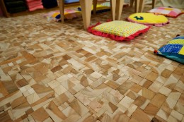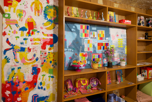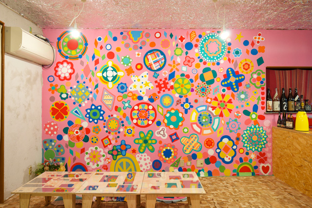 その言葉の通り、店内はすべて手作りだ。床は、滋賀県立大学の学生と一緒に総勢30人で廃材を切って並べた。ピンクが印象的な壁は、Mu-Muというアクセサリーブランドのデザイナー森菜実子さんによるものだ。他の壁面にもこれから活躍が期待される若い人たちによって絵が描かれている。店内はこれでもかというほどいろんな色で溢れている。