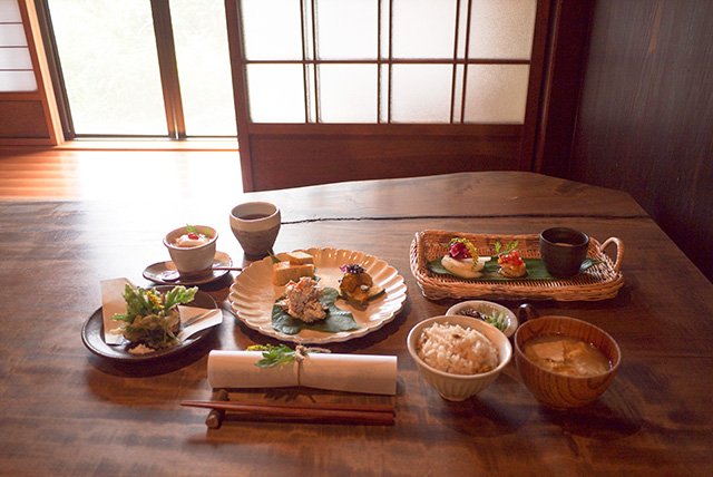 「山のごはん よもぎ」は、季節に合わせた薬膳料理を出してくれるごはん屋さんだ。薬膳と聞くと、漢方薬のような味を連想するかもしれない。しかし上野さんがつくる薬膳料理には、そうした薬くささはない。また、きれいに手入れされた古民家の空間のなかで、前菜、おばんざい盛、メイン、ご飯・汁物・香物、デザートと順番に出てくる料理は盛り付けも美しく、ぜいたくな気持ちになれる。ひとつひとつ、素材の味が生かされた、滋味ぶかい味わいだ。