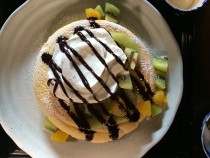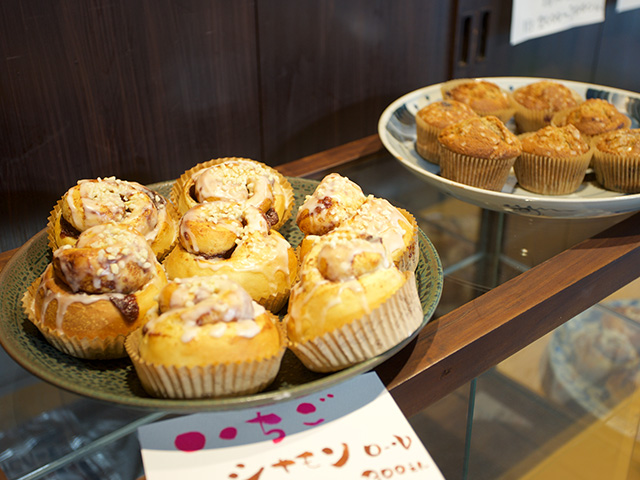 カフェメニューは、抹茶オーレやほうじ茶オーレ、コーヒーなどの飲み物に、チョコバナナやキャラメルのパンケーキ、マフィンやシナモンロールなど。食育を学んだ経験から、どれも材料にこだわり厳選したものを使っている。