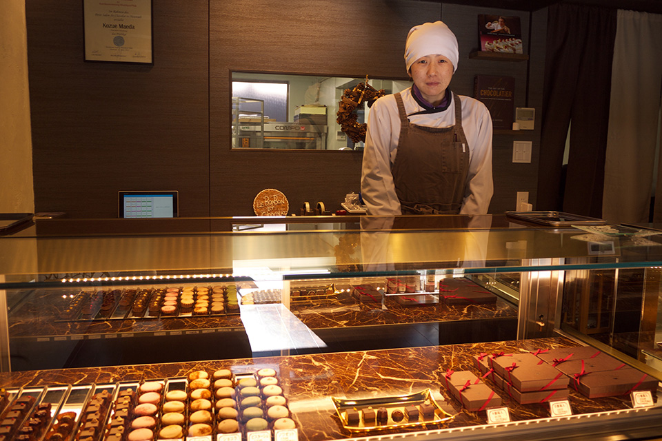店主の前田こず枝さんは、長浜出身。製菓学校を経て、大阪の洋菓子店で10年間パティシエとして働いた後、さらに2年間、フランスのパティスリー・ショコラトリーで経験を積んだ。「ショコラトリー」とはフランス語でチョコレート専門のお店のこと。そこで働くのは、チョコレート専門の教育を受けてきた「ショコラティエ」。本場フランスでは、チョコレートは他のお菓子と区別された専門の領域なのだという。「フランスやベルギーには、ものすごくたくさんのチョコレート屋があります。どんな田舎でもチョコレート屋が何軒もあって、チョコレートは、人びとにとって本当に身近な存在」と前田さん。本場のチョコレートの美しさ、おいしさ、楽しさに魅せられ、チョコレート屋をしようと決めた前田さんは、それからフランス・ベルギーじゅうに足を伸ばし、数えきれないほどのチョコレート屋を巡ったという。自分の食べたい味を見つけては、それに近づくよう試作を繰り返した。