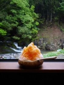 その水のおいしさが一番味わえるのは、やはりかき氷。2日間、じっくり時間をかけて大きな氷を自家製氷し、それを切り出してつくっているというかき氷の氷は、ふわふわと柔らかく口の中で溶ける。季節ごとにメニューが変わるミツも手作りで、多賀人参、ゆず、抹茶など、地元の素材からつくられている。澄んだ水の味が、手作りのやさしい甘さとともに味わえる。まさにここでしか味わえない贅沢なかき氷なのだ。