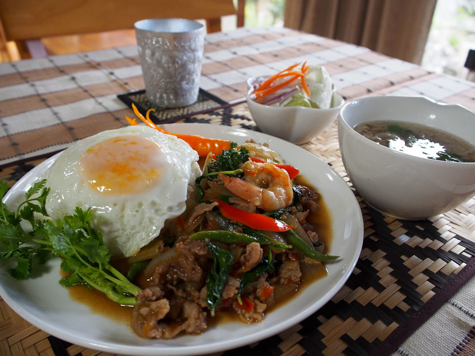 「本場の味を味わってほしいし、安全・安心に食べられるものがいいから、自分でつくるのが一番。ほかの野菜も、ほとんどわたしが育てているから、季節の野菜で料理します」というラムヤイさんは、食堂をするかたわら、無農薬・減農薬でさまざまな種類の野菜を育てている。そして朝、畑で採った新鮮な野菜を、ラムヤイさんは食堂で調理して出す。この日も、目玉焼きのせ鶏肉のバジルご飯「パットカプラオ」セットを注文すると、庭へ出て、さっとハーブを摘んでから台所に立っていた。庭にはパパイヤまで植わっていた。