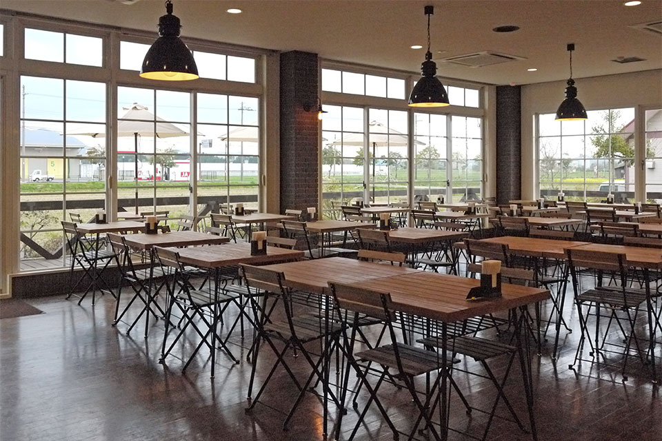 店を訪ねると、全部で70席あるという広々した客席の向こうに、のどかな緑の農地をのぞむテラスがある。大きな窓に三方を囲まれた空間は、テラスの延長のような気持ちのいい開放感がある。リニューアルに際して、以前は使用していなかったテラスに席をつくり、店名も新たに「マーガレットテラス」としたのだそうだ。