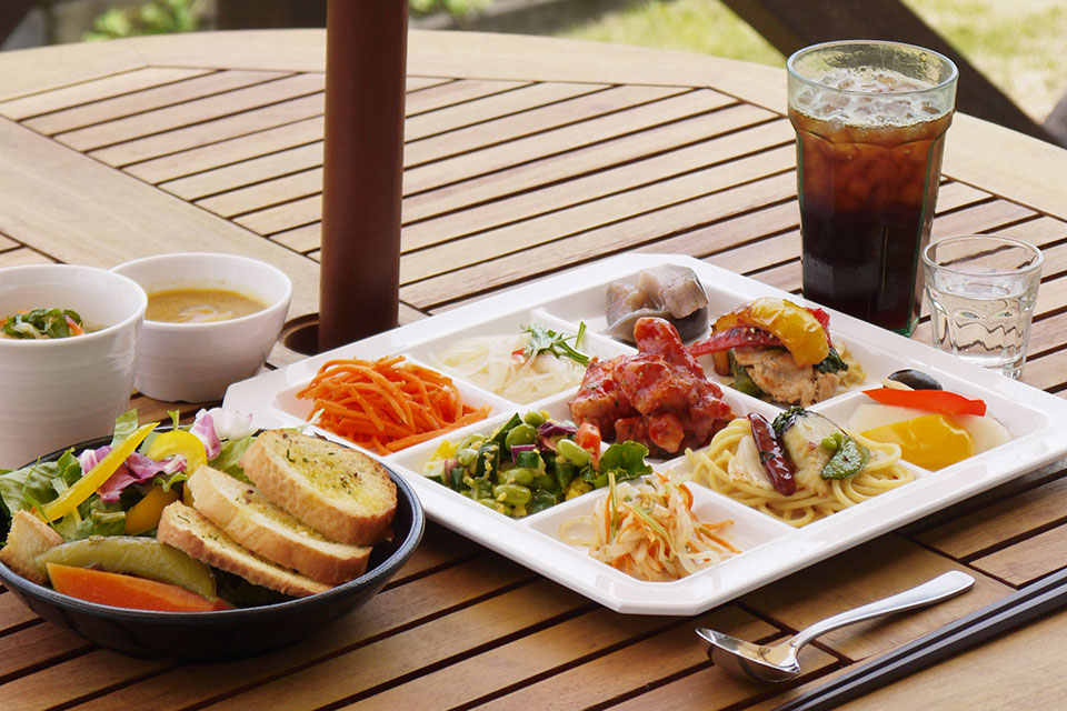 東近江を中心に県内産の野菜をふんだんにつかったメニューが20種類以上そろうビュッフェは、1時間おかわり自由で1680円。野菜料理というと、地味で淡白なイメージを持つ方も多いかもしれないが、マーガレットテラスのメニューは、見ためにも鮮やかな幾種類ものサラダやピクルス、パスタ、カレーから、丁子麩のからし和え、赤こんにゃく、浅漬け、東近江産の米粉を使った唐揚げなど、味のバリエーションも豊富で食べごたえもあり、ずらっとならぶ料理から自分で組み合わせを考える楽しみもある。