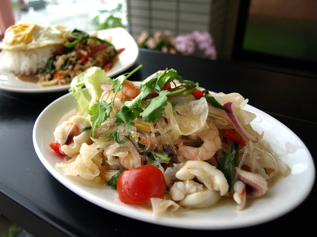 そんなランさんからすすめていただいたのが、ヤムウンセン。サラダの一種で春雨にスライスした玉ねぎやトマト、魚貝がたっぷり入っている。春雨のつるっとしたのどごしのなかに、辛さと酸味の勢いがすごい。じんわりと汗が出てくると、暑さにへこたれた身体が浄化されていく感じがする。夏こそ、ヤム・タイを最も楽しむことができるのかもしれない。