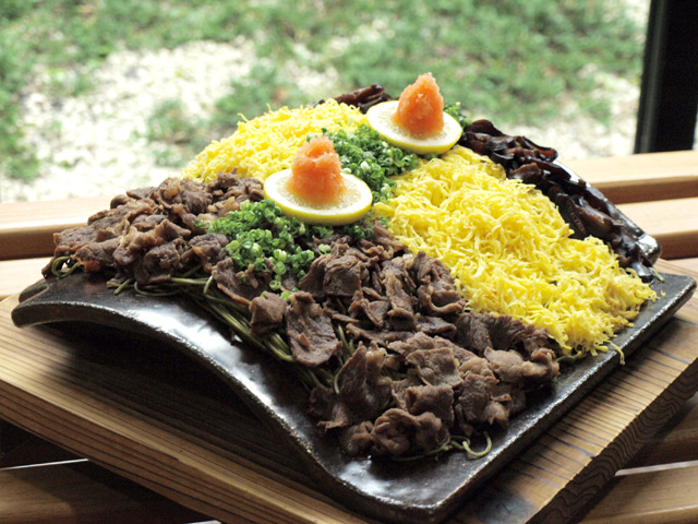 料理長の徳久勲さんによると、「瓦そば」は山口県の名物料理。「佐賀県出身なので、けっこう身近な食べ物だったんです。戦国武将たちは戦のとき焼いた瓦の上で干飯(ほしいい)を温めて食べていたそうですので、『戦国瓦そば』と名づけてお出ししています」