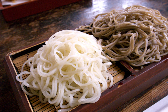 「変わり蕎麦」というのは、更級粉(さらしなこ)で打った蕎麦に柚子や芥子、茶などの風味をつけた蕎麦だ。精製度の高い真っ白い蕎麦粉で打った蕎麦は透明感がある。