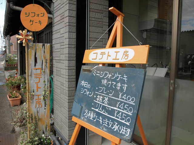 「コテト工房」を見つけたのはそんなときだった。シフォンケーキという看板に惹かれてガラス戸を開けた。店内はちょっと風変わりな造りだ。ケーキが焼かれているのであろうキッチンスペースが売り場にもなっていて、ラックに小ぶりのシフォンケーキとパウンドケーキが並んでいる。