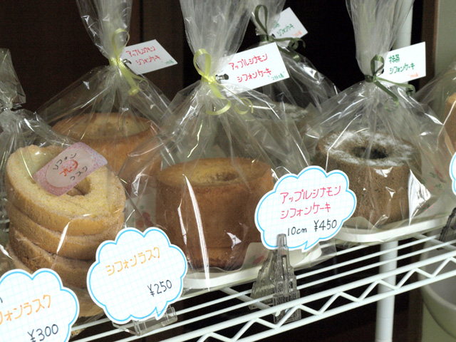 シフォンケーキ(10cm)プレーン400円、その他450〜500円。10cm以上のサイズや、デコレーションなども予約注文可能。