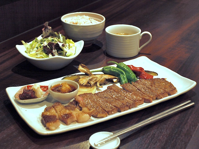 ランチ: ステーキランチ2,500円、パスタセット1,000円など / ディナー: イベリコ豚の鉄板焼き1,500円、和牛ロース or ヒレステーキ2,500円〜など。アラカルトメニュー(500円〜)のみでの食事も可。
