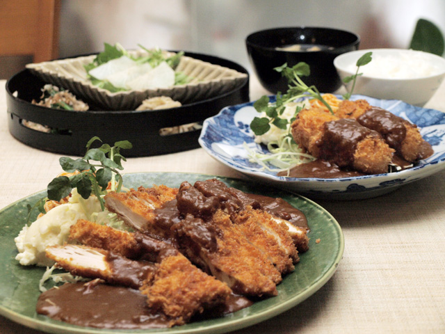 大和さんのおすすめはチキンカツ定食だ。「料理の道を歩んでまだ数年、今は基本に忠実に作ることを心がけています」という。ほうれん草のおひたし、もやしとえのきの炒め物、水菜と大根のサラダに続き、ドミグラスソースがたっぷりかかったチキンカツが2枚…。これにご飯と具沢山のおみそ汁がつく。ソースはドミグラスソース以外譲らない、注文を聞いてからしかパン粉をつけない、「何よりおなかいっぱい食べてもらいたい」。ふと「質実剛健」という熟語が浮かぶ。『飾り気がなく真面目であり、かつ心身ともに健康で強くたくましい様子』を意味するこの言葉が、大和さんの人柄にも料理にもぴったりくる。