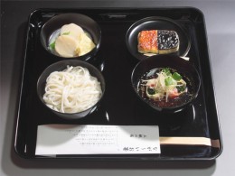 里芋を白味噌で炊き合わせたもの、2種類の味噌を使った豆腐田楽に続いて、かまあげのうどんが順に運ばれてくる。「普段から私たちが食べているものばかりです。凝ったものではありませんが……。禅宗では悟りの世界は丸、迷いの世界は四角で表現します。里芋やうどんのつけつゆに入れた湯葉巻きは悟りの世界、豆腐は迷いの世界となります」と説明をいただく。