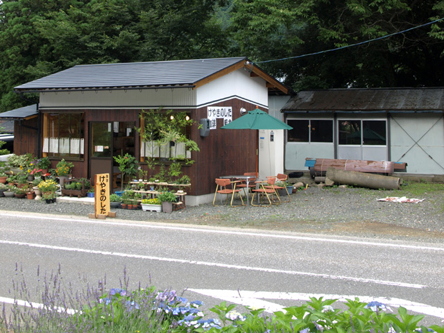 旧木之本町の杉野、国道303号線沿いにオープンしたコーヒーと軽食の店「けやきのした」は、国道と並行するように蛇行する杉野川の土手沿いにある。店名のとおり、大きな欅の木がお店に影を落としている。