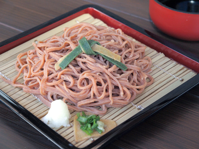 11月からは変わりそばの「縁結びそば」が登場した。麺に町内産のトマトを練り込んだざるそばだ。にんじんとほうれんそうを使ったそばの結び目が飾られている。麺はほんのり赤みがさしていて、薬味の大根おろしの下にはにんじん麺で作ったハートの型が敷かれている。