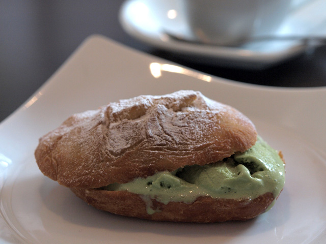 こちらは、もちっとした食感に仕上げたドーナツを使っている。「アイスとの食感の組み合わせを大事にして、テイクアウトで食べ歩きをしたときに口の周りが汚れず済むような生地なんです」。