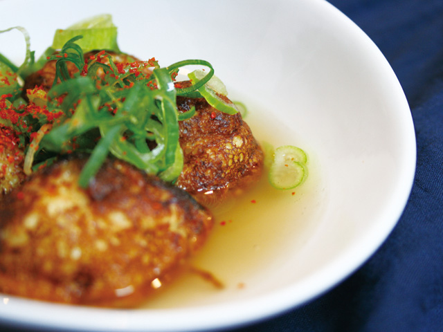 「いかに煮込んで柔らかくするか」という森さんの言葉どおり、とろけるような食感の牛すじである。トッピングされた九条ネギと、京都から取り寄せるという柚子七味がほどよいアクセントになっている。小腹を満たす軽食としてもおすすめだが、ビールのおつまみにもぴったりだ。