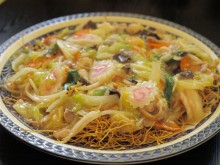 ところで、皿うどんを注文すると、瓶入りのソースがついてくる。「皿うどん専用のソースを長崎から取り寄せています。初めはそのままで、次にソースをかけて食べてみてください」。説明のままに少し食べてからソースをかけてみると、ウスターソース風……。「2度楽しめるでしょう」と久子さんは笑っている。もちろんソースはお好みだからかけてもかけなくてもいい。