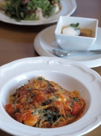 FUKUMOTOのランチは、旬の野菜をふんだんに取り入れたサラダミスト、5種から選ぶパスタもしくはリゾット、パン、6種から選ぶデザート、飲み物がつく。健さんが料理を、愛さんがケーキや焼き菓子、パンをつくる。