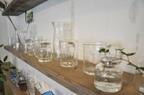 滋賀県下をはじめ、日本各地の窯元や作家と直接交渉して買い付けてくる器や硝子製品、アナログな生活雑貨がそろう。河原崎優子さんの作品は器1,995円〜、スプーン置き550円。イラン宙吹き硝子は1,300円〜、など。