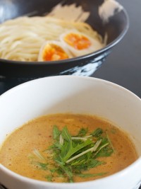 宮川さん曰く、十二分屋は「ラーメン屋というよりつけ麺屋」なのだそうだ。一番の売りである「つけめん」は、ファンが多いという大成食品の太麺を使用。多加水でもちもちとした食感が特徴だ。スープは、魚介系と豚骨・鶏のWスープに甘酢の酸味がほどよく効いて濃厚だがさっぱりとした味わい。スープの中には、葱と大きめのメンマ、ほろほろのチャーシューが入っていて食べごたえがある。麺の量が、「並」「大盛」「特盛」「3玉」の4種類から選ぶことができるのも嬉しい。