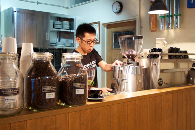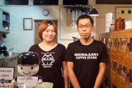 MICRO-LADY COFFEE STANDもそんなサードウェーブの最先端を行くコーヒースタンドだ。店を営むのは木村宏さん・瑞穂さん夫妻。 もともとコーヒーが好きだったという宏さんは、数年前、コーノ式ドリッパーに興味を持ち、彦根市日夏のコーヒー店 Yeti Fazendaに通ううちに、ドリップコーヒーの魅力に取りつかれたのだそうだ。それからコーヒーに夢中になり独自に研究を重ね、イベントなどに出店するようになった。1年前に仕事を辞め、東京のバリスタの専門学校に通い、コーヒーの専門的な知識やエスプレッソマシンの技術を習得し、この店をオープンした。