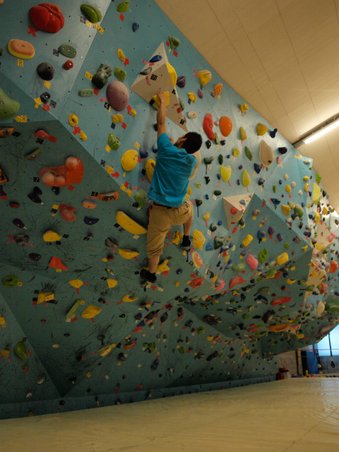 さて、ボルダリングとは岸壁を登るロッククライミングの中でも、ロープなどを使わず最も少ない道具で登る種目だ。ここには3種の平面壁と全長16m、高さ4mという大きな3D壁面がある。これらの壁面は本物の岩場をイメージして作られた人工壁で、ホールドと呼ばれる手で掴む部分の配置を定期的に変更し、初級者から上級者までが常にレベルアップ出来る環境を作っている。