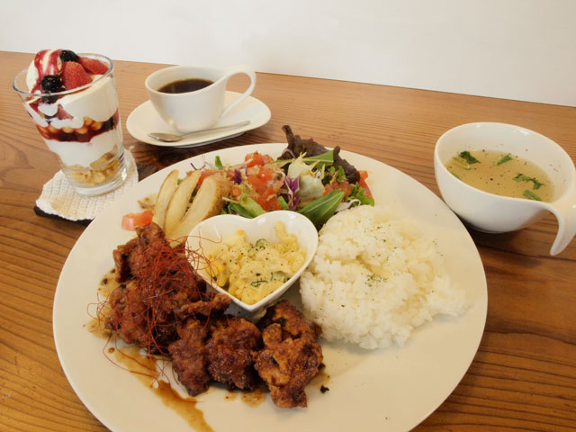ランチは一枚の皿に彩り良く盛りつけられたプレートランチがおすすめ。中でも「からあげの甘酢香味ソース仕立て」はネギの香りとピリ辛な味つけが楽しめる中国出身の昭紅さんならではの一品。ご飯の大盛りは無料なので男性でも十分満足のボリュームだ。プレートランチ9種の他にも、人気のトンカツをはさんだ「ジューシーカツサンド」や「ハワイアンロコモコ丼」などがどれも880円と手頃な価格。デザートも自慢のオリジナルプリンやパフェなど種類も豊富だ。