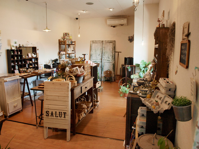 そんな食事が楽しくなるような食器を、カフェだけでなく毎日の暮らしにも取り入れてほしいという思いから、昨年の6月にオープンしたのが食器専門店「Salut!(サリュー)暮らしの道具店」だ。米原市高溝の国道8号線沿いにあるお店には食器や家具、小物や雑貨が所せましと並んでいる。