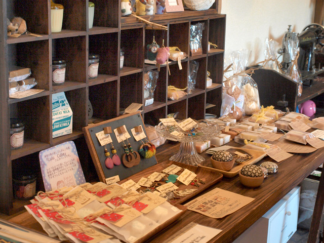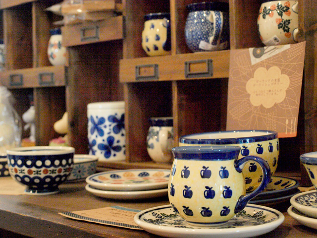 昨年秋からはさらにスペースを拡張して、西尾さんがセレクトした手作りの商品も販売するようになった。消しゴムハンコやフェルトの人形、アクセサリー、ナチュラルソープなど、県内外の作家7人ほどの作品を常時取り扱っている。そのほかに、北欧ならではの温かみのある絵柄の描かれた「ポーリッシュポタリー」という食器もポーランドで一つ一つ手で描かれたもので人気とのことだ。