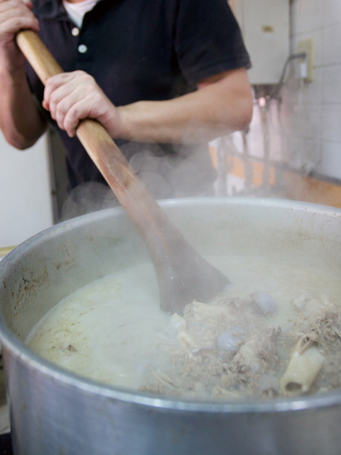 店内はカウンター席が7席のこぢんまりとした空間で、店主の鯰江智一さんが一人で切り盛りする。カウンターの向こうには大きな寸胴鍋。この鍋で20時間以上かけて鶏白湯と豚骨スープがつくられるのだという。