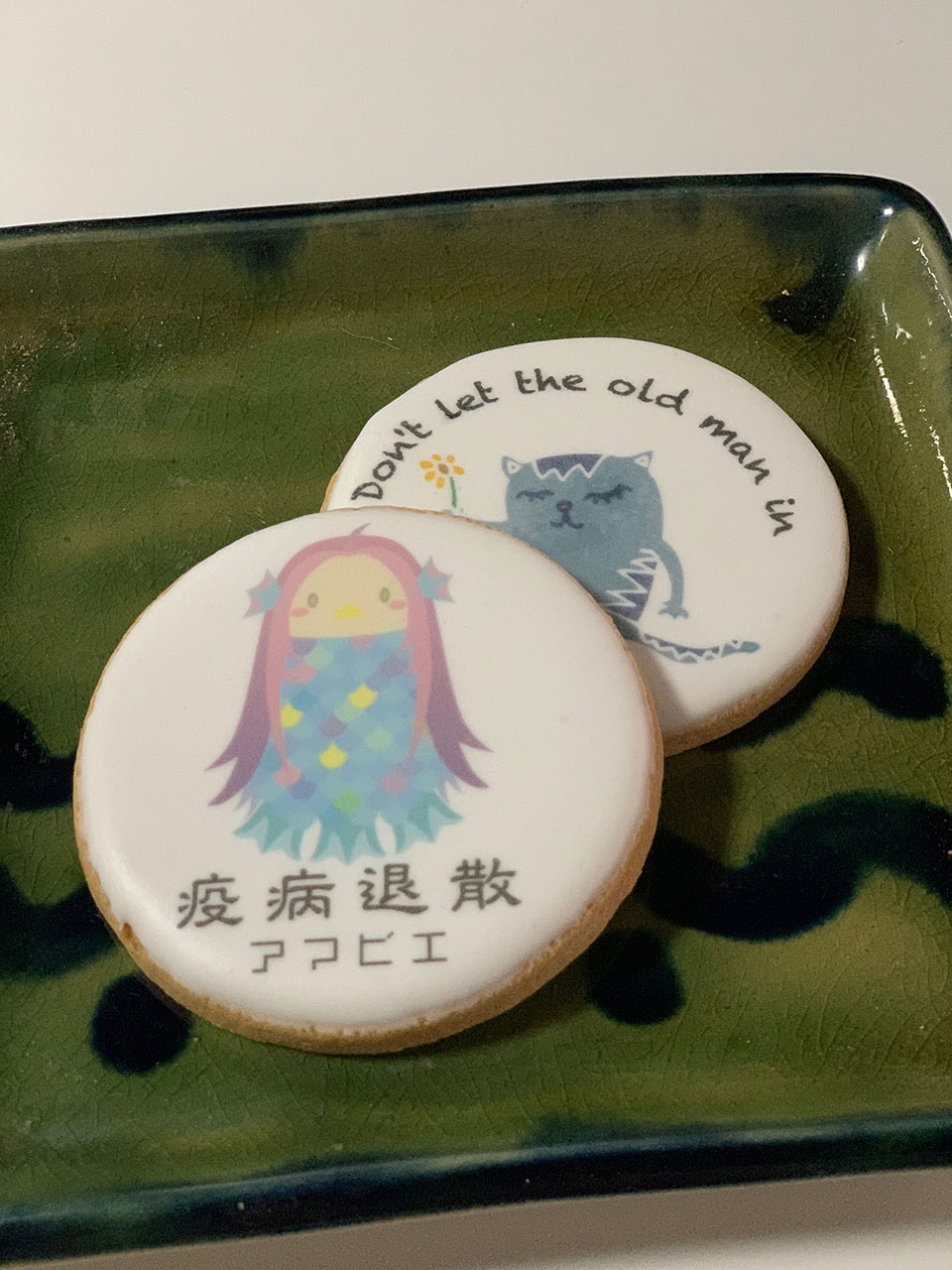 ????原さんは「データを送っていただければ、プリントしてお送りします。結婚式やお誕生日の記念品にぜひご利用ください」と話す。ロゴマークを入れれば宣伝にも使えるだろう。1枚から注文可能。早速、アマビエをデザインした疫病退散のデータを送った。オリジナルプリントのクッキーは子どもたちに気に入ってもらえそうだ。