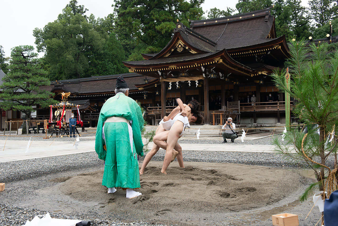 「古知古知相撲」奉納は、東方 「多賀の里」小田龍斗さん、西方「寿命ケ石」林建伸さん、弓取り式は伊藤羽祐麻さんの滋賀県立大学1年生の3人が大役を担った。